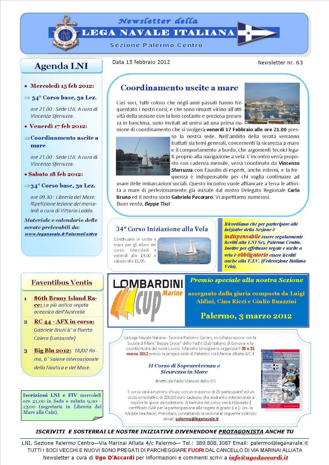 | SABATO 3 MARZO 2012 ORE 11 PRESSO IL MUSEO DEL MARE : PREMIO LOMBARDINI CUP Giornata di festa per la nostra sezione che riceverà presso il Museo del Mare di Palermo il “Premio Speciale Lombardini Cup” per la partecipazione con Fishbone il First 40.7 di Lorenzo Spataro e Michelangelo Gruttadauria alla Regata Palermo Montecarlo 2011 con un equipaggio che ha saputo coniugare risultati sportivi e sociali. Il premio sarà consegnato dal responsabile della Lombardini Luigi Aldini, saranno presenti tra gli altri Giulio Guazzini (popolare giornalista RAI della vela) e Cino Ricci. Dopo la consegna del premio ed il piccolo buffet offerto dalla sezione andremo, con Cino Ricci ospite d'onore, tutti alla Cala per l'inaugurazione del locale appena consegnatoci dall'Autorità Portuale. | ||||||||